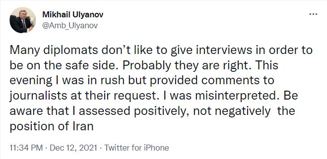 دیشب (یکشنبه) پس از پیگیریهای انجام شده با دفتر نمایندگی روسیه نزد سازمانهای بینالمللی مستقر در وین، اولیانوف در توئیتی از تحریف انجام شده در ترجمه سخنانش انتقاد و تصریح کرد که وی در گفتوگو با خبرنگاران موضع ایران را در مذاکرات وین مثبت ارزیابی کرده است.