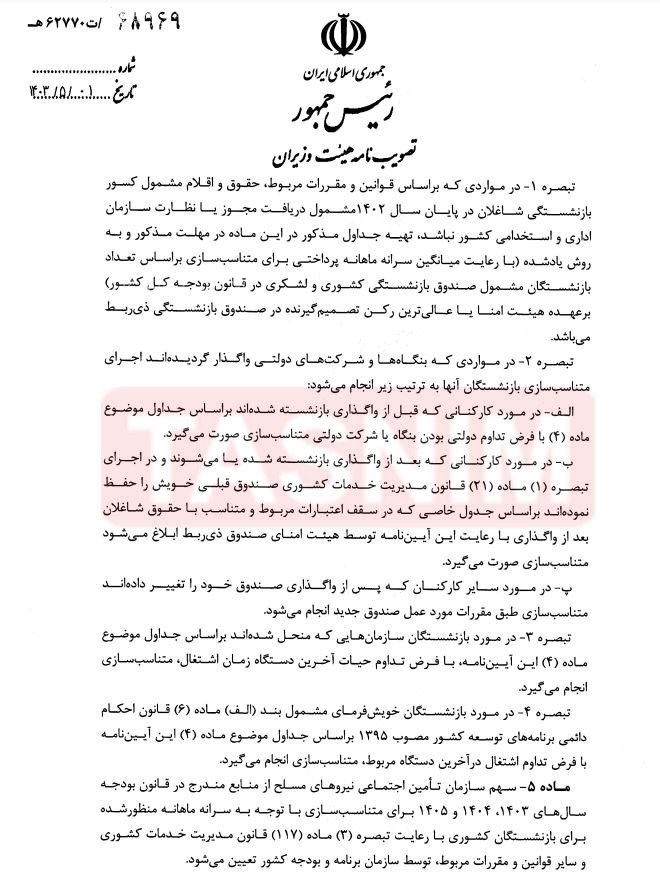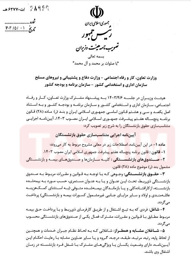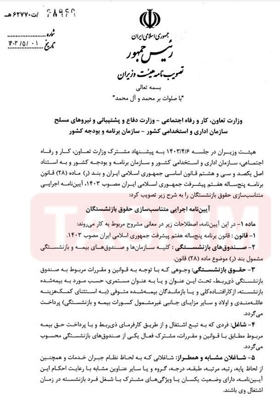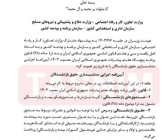 متن آیین نامه اجرایی متناسب سازی حقوق بازنشستگان به شرح زیر است: