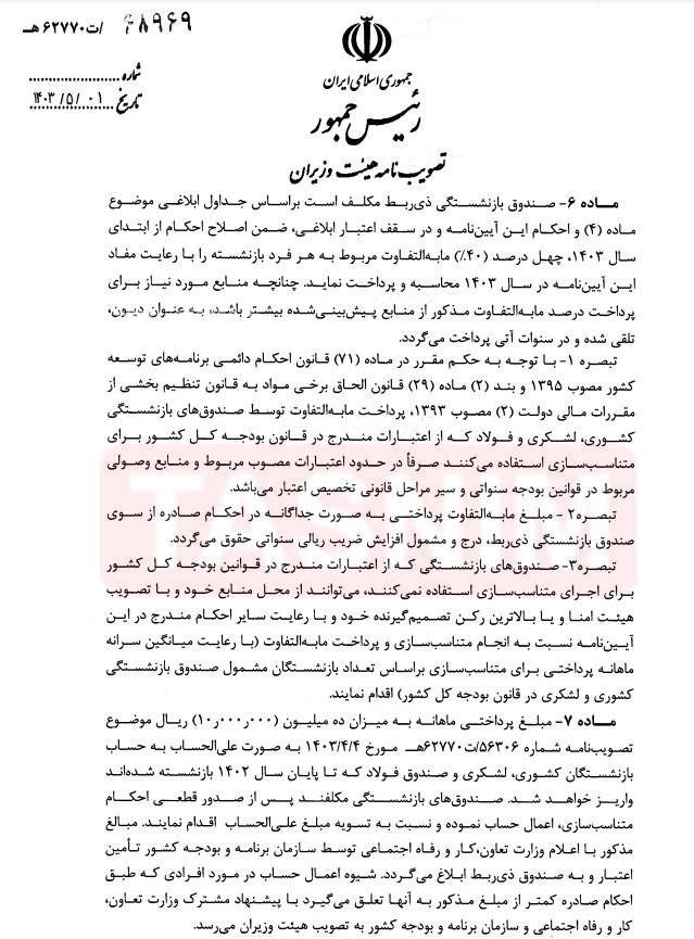 ماده 7- مبلغ پرداختی ماهانه به میزان ده میلیون (10.000.000) ریال موضوع تصویبنامه شماره 56306/ت62770هـ مورخ 4/4/1403 به صورت علیالحاساب به حساب بازنشستگان کشوری، لشکری و صندوق فولاد که تا پایان سال 1402 بازنشسته شدهاند واریز خواهد شد. صندوقهای بازنشستگی مکلفند پس از صدور قطعی احکام متناسبسازی، اعمال حساب نموده و نسبت به تسویه مبلغ علیالحساب اقدام نمایند. مبالغ مذکور با اعلام وزارت تعاون، کار و رفاه اجتماعی توسط سازمان برنامه و بودجه کشور تأمین اعتبار و به صندوق ذیربط ابلاغ میگردد. شیوه اعمال حساب در مورد افرادی که طبق احکام صادره کمتر از مبلغ مذکور به آنها تعلق میگیرد با پیشنهاد مشترک وزارت تعاون، کار و رفاه اجتماعی و سازمان برنامه و بودجه کشور به تصویب هیئت وزیران میرسد.