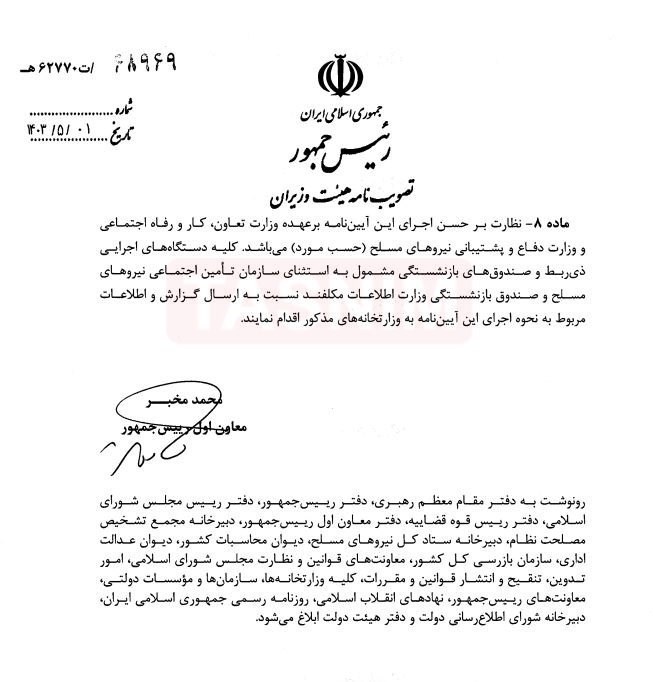 محمد مخبر معاون اول رئیس جمهور آیین نامه اجرایی متناسب سازی حقوق بازنشستگان را ابلاغ کرد.