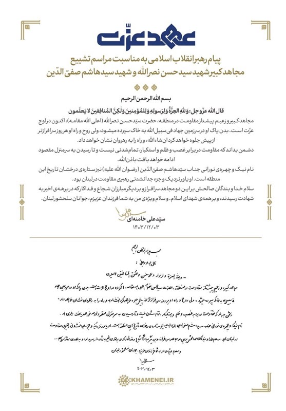 رهبر معظم انقلاب در پیامی به مراسم تشییع پیکر شهیدان نصرالله و صفیالدین فرمودند: مجاهد کبیر و زعیم پیشتاز مقاومت در منطقه، حضرت سیّدحسن نصرالله (اعلی الله مقامه)، اکنون در اوج عزّت است.