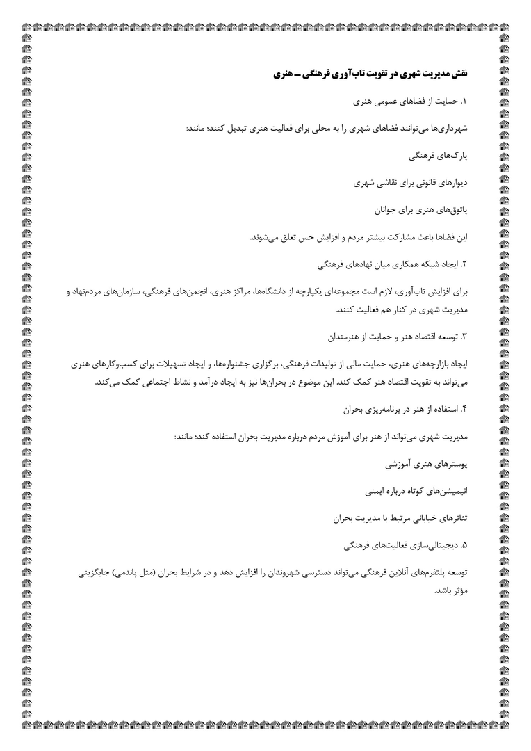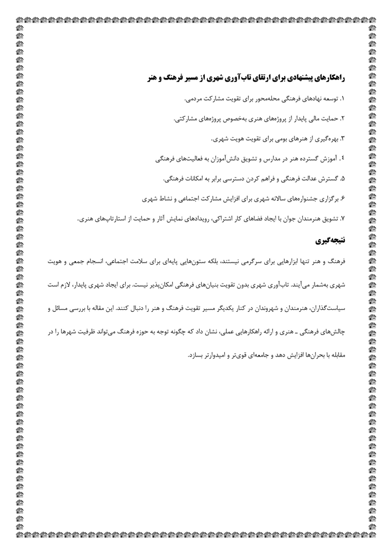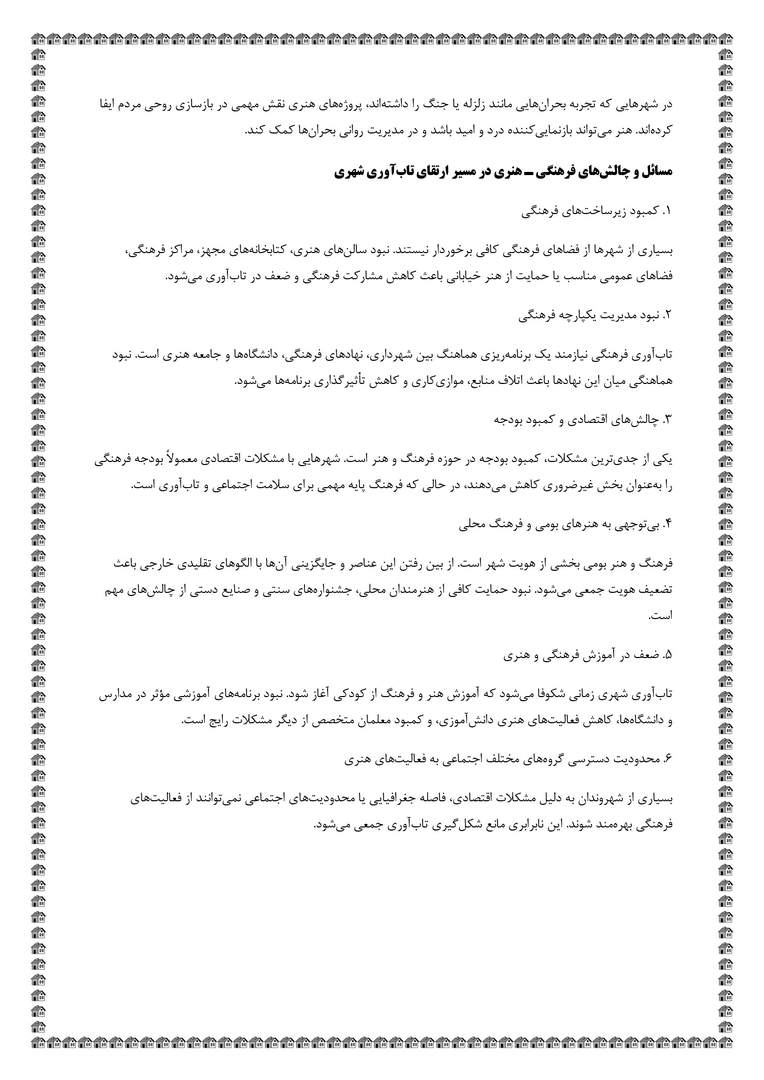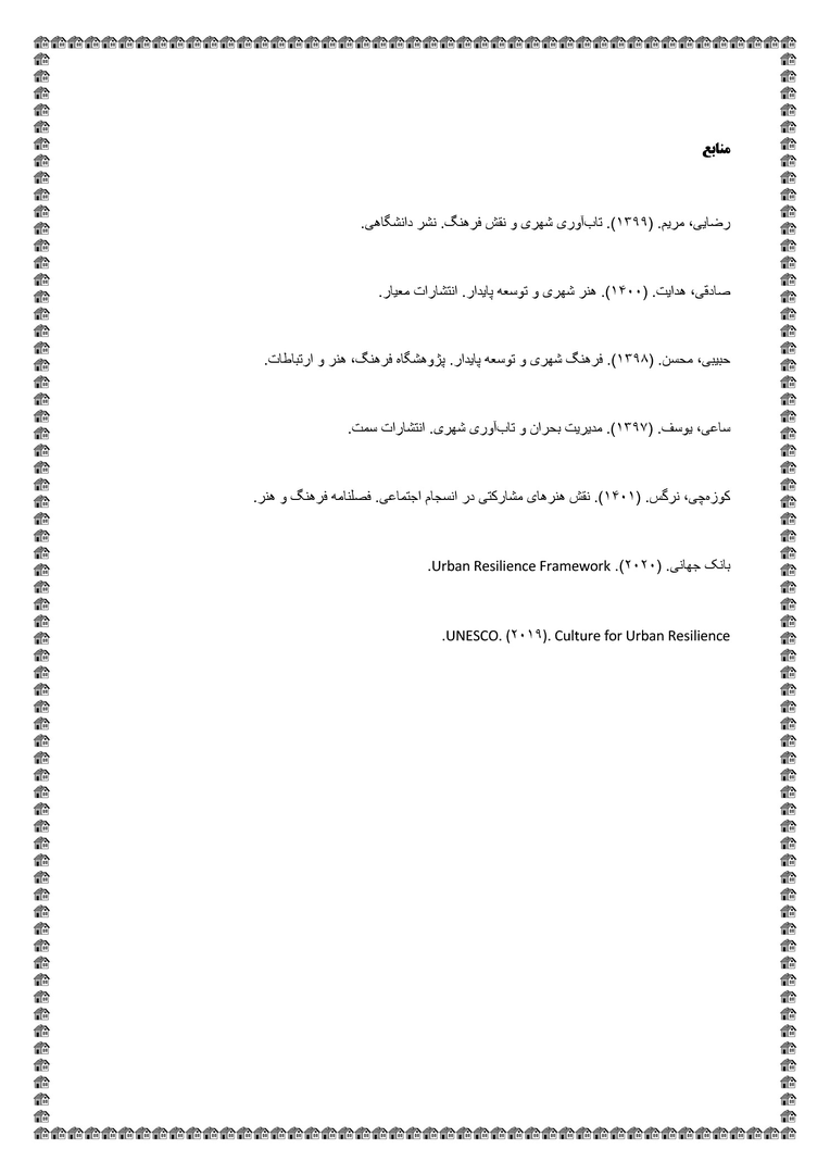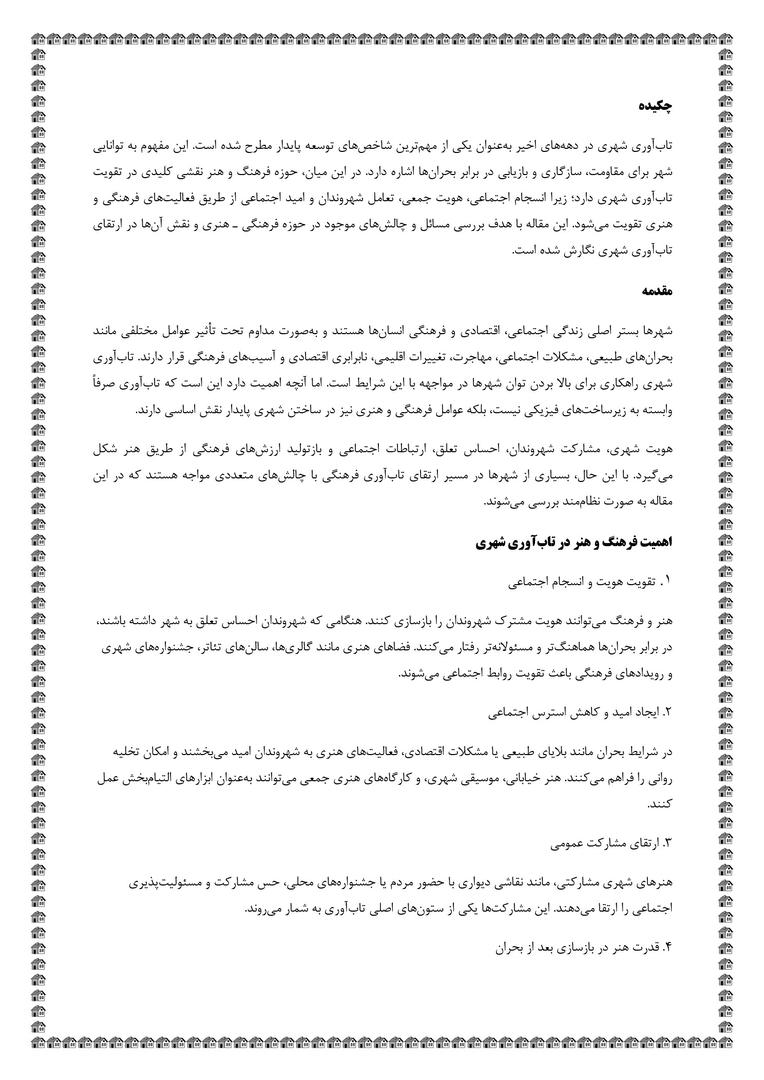 بررسی مسائل و چالشهای فرهنگی هنری در ارتقای تابآوری شهری و پدافند غیرعامل + فایلPDF