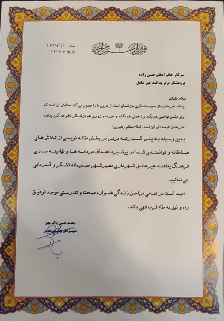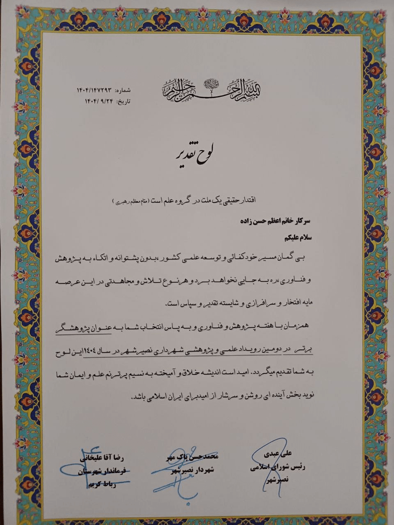 به گزارش نبأپرس، اعظم حسنزاده با مدرک کاردانی معماری و مهندسی شهر سازی همچنین ارشد برنامه ریزی شهری با بیش از ۱۸سال سابقه کاری که در حال حاضر کارمند شهرداری نصیرشهر می باشد موفق شد طی دو سال متوالی با ارسال مقالههایی پیرامون موضوعات شهری در همایش هفته پژوهش شهرداری نصیرشهر، عنوان پژوهشگر برتر دومین رویداد علمی پژوهشی شهرداری نصیرشهررا کسب کرد.