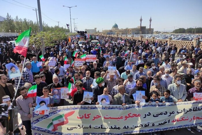 در این مراسم، راهپیماییکنندگان با سر دادن شعارهایی چون «ملت ما بیدار است از فتنهگر بیزار است»، «مرگ بر منافق»، «وای اگر خامنهای حکم جهادم دهد»، «مرگ بر ضد ولایت فقیه»، «مرگ بر آمریکا»، «مرگ بر اسرائیل»، «مرگ بر انگلیس»، «مزدور آمریکایی به جنگ دین آمده» و … انزجار خود را از اغتشاشات اخیر و هتاکی به ساحت مقدسات ابراز کردند.