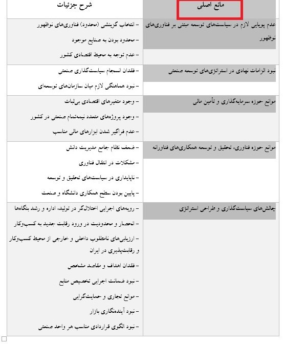 این موانع شامل عدم انسجام در سیاست‌گذاری، چالش‌های حوزه سرمایه‌گذاری و تأمین مالی، ضعف در مدیریت دانش و تحقیق و توسعه، و محدودیت‌های ناشی از سیاست‌های تجاری و رقابت‌پذیری است. جدول زیر، مهم‌ترین موانع تحقق سیاست‌های صنعتی کشور را در دسته‌بندی‌های مختلف ارائه می‌دهد تا زمینه‌ای برای تحلیل دقیق‌تر و اصلاحات لازم در این حوزه فراهم شود.