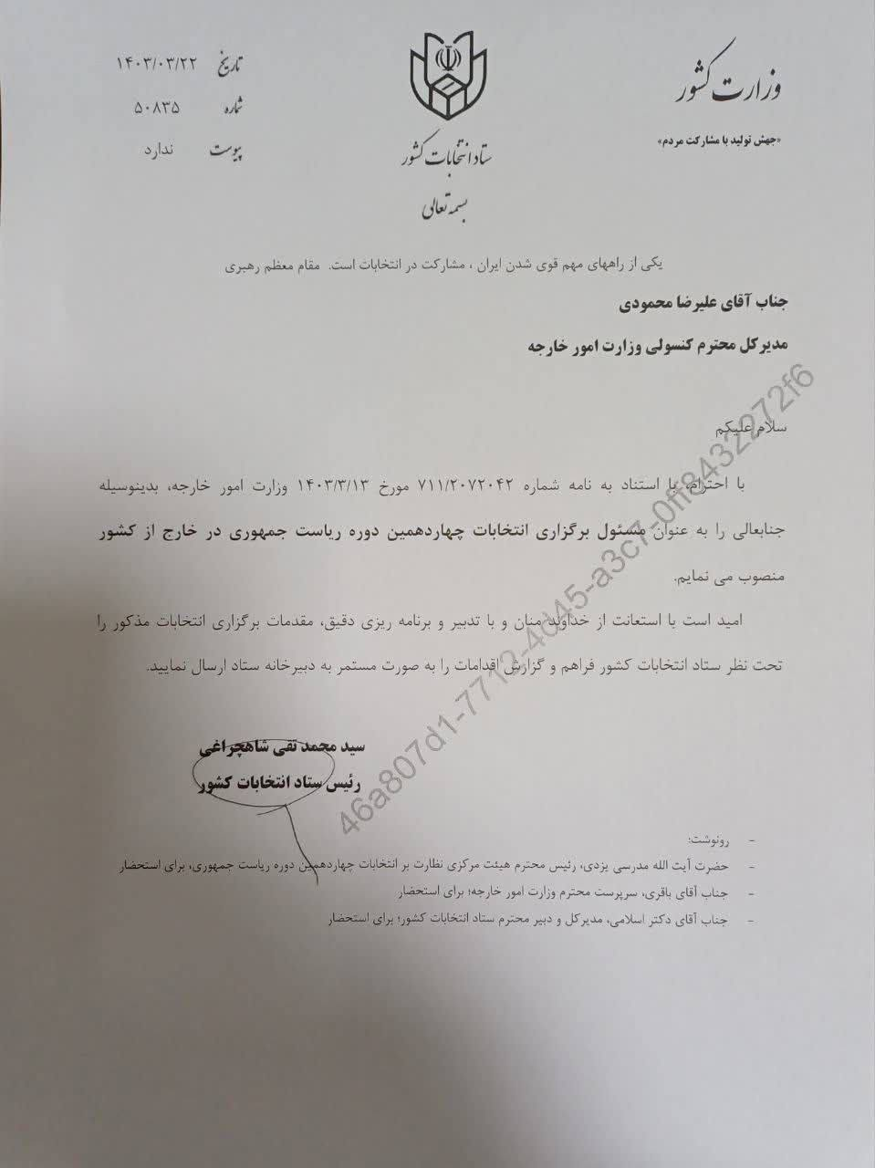 مسئول برگزاری انتخابات ریاست جمهوری درخارج از کشور منصوب شد