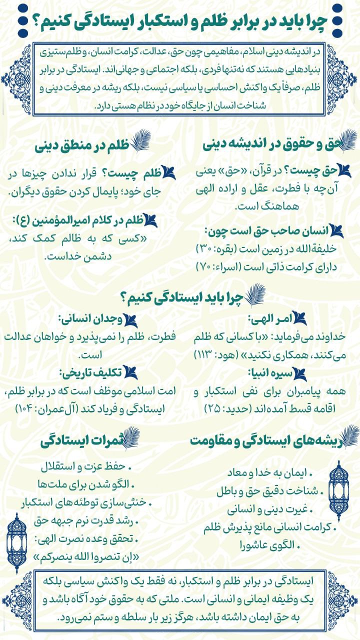 در ایفوگرافی زیر دلایل ایستادگی در برابر ظلم و استکبار از دیدگاه دینی و اعتقادی به تصویر کشیده شده است:
